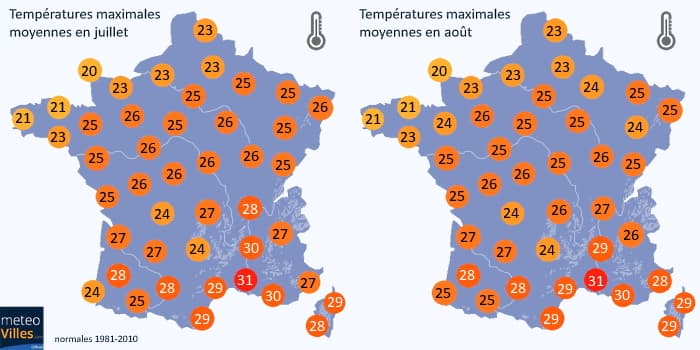 Températures maximales moyennes en France aux mois de juillet et d'août - Météo Villes