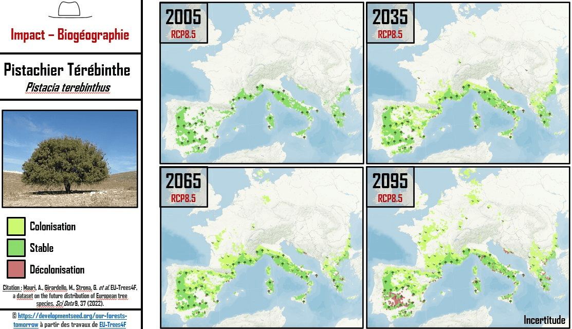 Bien entendu, ces projections sont basées sur un scénario d'absence de politique efficace de réduction des émissions de gaz à effet de serre. Pour plus d'informations sur le sujet, nous vous invitons à lire le thread de Serge Zaka sur son compte X, qui traite également d'autres espèces végétales.