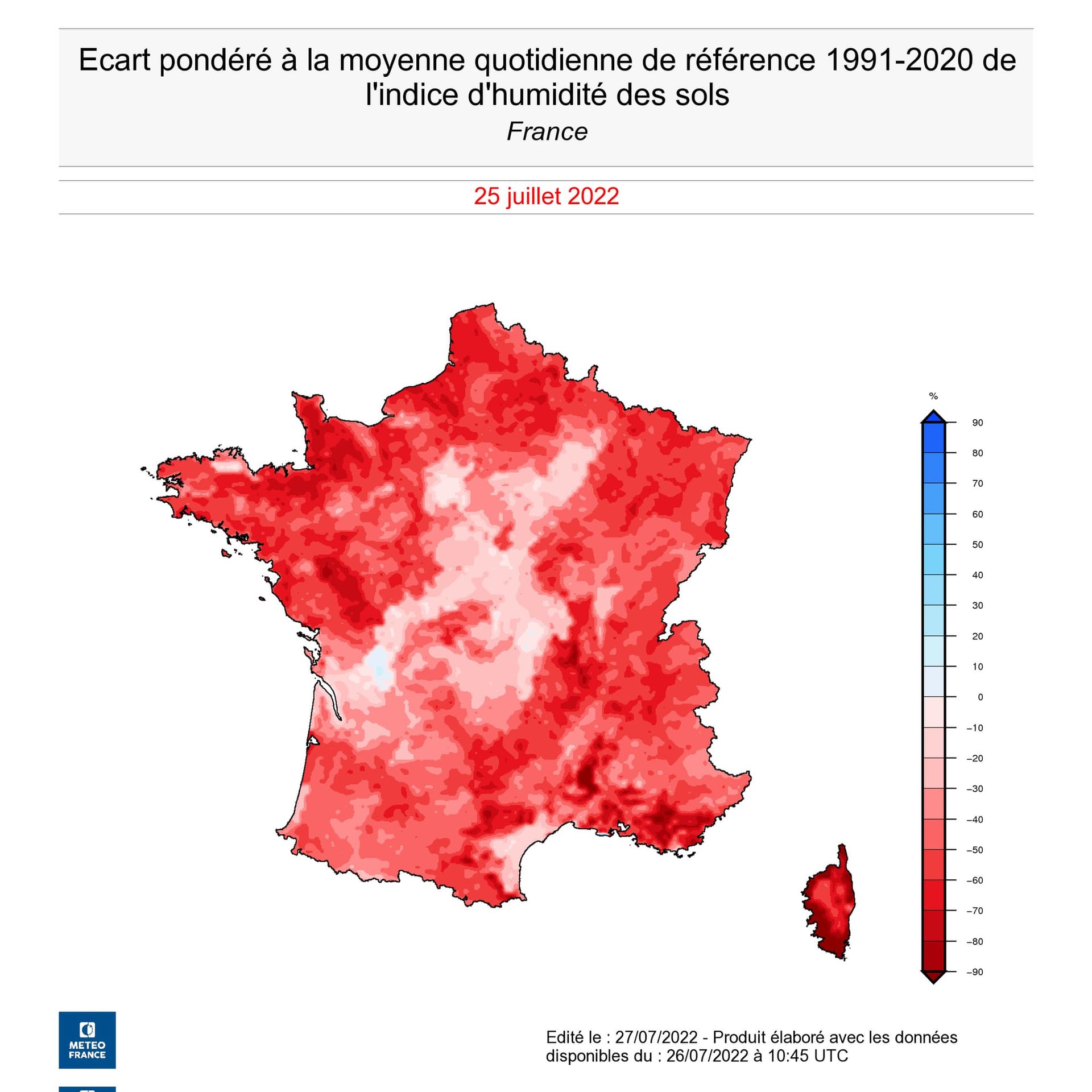 Ecart à la moyenne de l'indice d'humidité des sols - 25 juillet 2022 - Météo-France