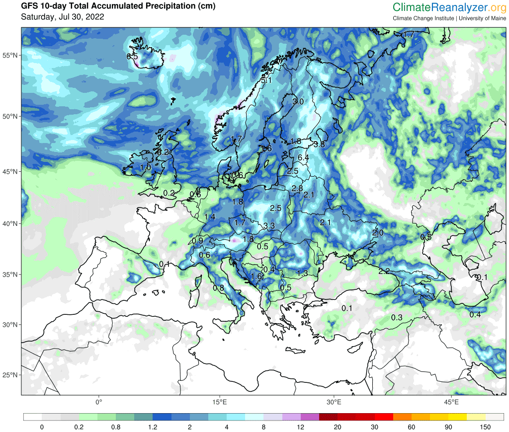 Quantités de pluies prévues sur 10 jours - du 30 juillet au 8 août 2022 - Modèle GFS via ClimateReanalyzer