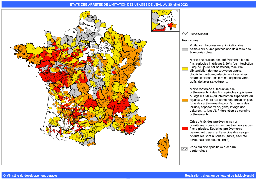 État des arrêtés de limitation sur l'usage de l'eau - 30 juillet 2022 - Propluvia