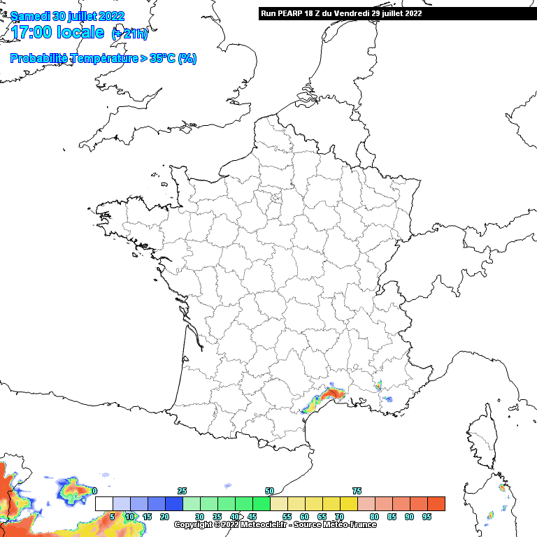 Probabilité de dépassement des 35°C - du samedi 30 juillet au mardi 2 août 2022 - Prévision d'ensemble Arpège via Météociel