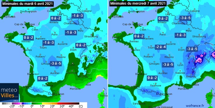 Prévisions des températures minimales des mardi 6 et mercredi 7 avril 2021 - via wofrance.fr