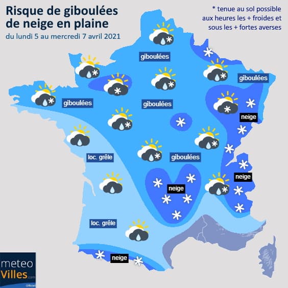 Si les giboulées ne concerneront pas le bassin méditerranéen, presque toute la France sera exposée à ce risque en première partie de semaine prochaine, dès lundi 5 avril pour le nord puis sur les autres régions les 6 et 7 avril. Le risque sera moindre sur les régions océaniques où quelques averses de grésil/grêle seront possibles. Il sera plus important sur le nord, le centre et l'est de la France où grésil, grêle et neige seront fréquemment observés sous les averses.