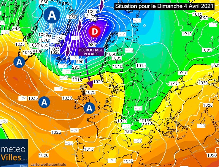 Pour comprendre pourquoi ce décrochage polaire va avoir lieu, il faut se pencher sur les hautes latitudes. En effet, on attend un très net renforcement de l'anticyclone au dessus du Groenland au cours du week-end. Les dernières projections du modèle américain anticipent des pressions pouvant atteindre les 1080 hPa ce dimanche 4 avril 2021 !