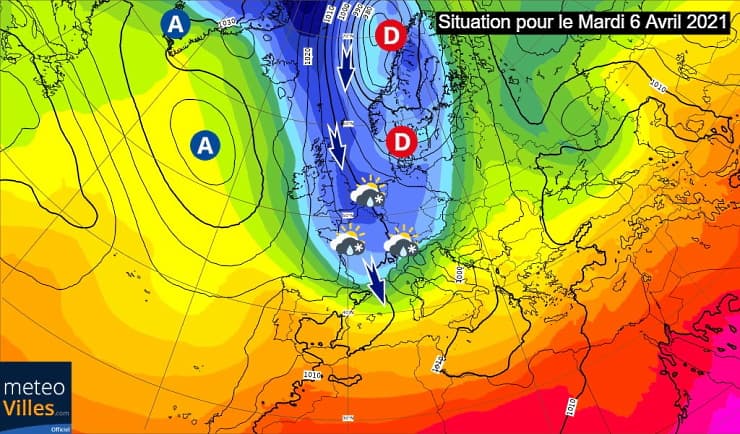L'arrivée de l'air polaire sera matérialisée par un front froid assez actif qui s'enfoncera sur la moitié nord de la France durant la journée du lundi 5 avril. En fin de front, de la neige fondante pourra être observée tant l'incursion d'air froid sera importante (notamment dans sa partie nord). Rapidement, un ciel de traîne prendra le relais sur les régions bordant la Manche avec la mise en place de giboulées (pluie, grésil, grêle et neige).
