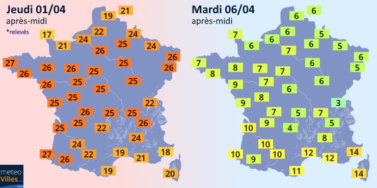 La carte de gauche montre les températures maximales relevées ce jeudi 1er avril, atteignant des niveaux records pour cette époque de l'année. On relevait souvent entre 24 et 27°C, dont un remarquable 27,5°C à Brest - valeur la plus chaude jamais observée si tôt dans la saison ! La carte de droite montre les valeurs maximales prévues pour le mardi 6 avril. La douche froide promet de faire mal puisque nous allons passer très nettement sous les normales avec une perte de 15 à 20°C sur 5 jours ! Sur le nord de la France, ce refroidissement sera déjà effectif le lundi de Pâques.