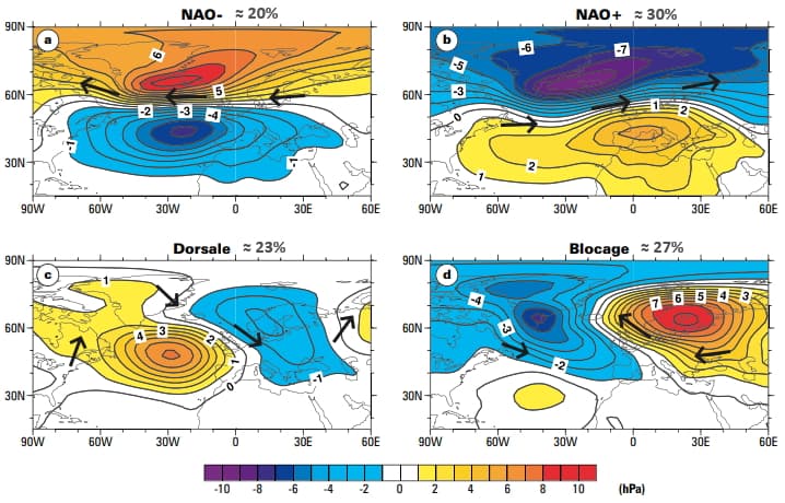 En Europe, on distingue 4 régimes de temps. Le plus fréquent est le régime de NAO+ (environ 30% du temps), correspondant à un anticyclone vers les Açores et la Méditerranée et des dépressions sur le nord de l'Atlantique, apportant sur l'Europe et la France un flux océanique (circulation zonale). À l'inverse, le régime de NAO- est le moins fréquent (environ 20% du temps). Dans cette situation, les centres d'action s'inversent avec un anticyclone aux hautes latitudes et des dépressions des Açores à la Méditerranée, faisant circuler les vents d'est en ouest.