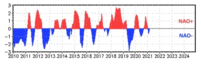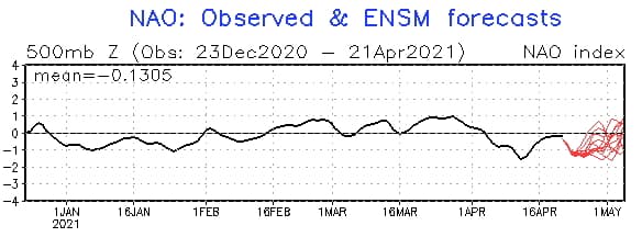 Indice d'oscillation nord-atlantique (NAO) du 23 décembre 2020 au 21 avril 2021 - via NOAA