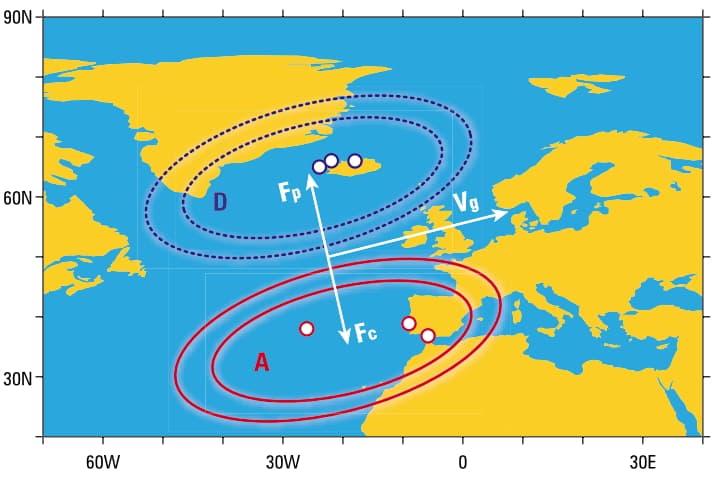 L'indice d'oscillation nord-atlantique (NAO) est calculé via la différence de pression entre les Açores et l'Islande. Traditionnellement, les dépressions sont présentes vers l'Islande et les hautes pressions vers l'archipel des Açores. Plus cette tendance est marquée, plus la circulation zonale (vents d'ouest) le sera. On parle alors de régime de NAO+.