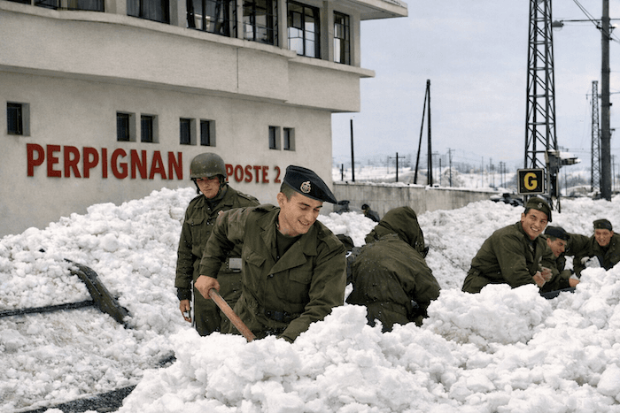Les 5 et 6 février 1954, une tempête de neige exceptionnelle frappe le Languedoc-Roussillon et la Basse vallée du Rhône. Perpignan est ensevelie sous 85 cm de neige, bloquant la circulation.  Des tranchées sont creusées pour les piétons.  L’effondrement de 28 maisons cause des dommages matériels importants, estimés à des centaines de millions de francs.  Le garage des trams est le premier touché, endommageant gravement les véhicules. Trois autres garages perpignanais et le bâtiment des halles centrales subissent le même sort.  Des chutes de neige importantes sont aussi enregistrées à Carcassonne, aux Saintes-Maries-de-la-Mer et à Montpellier.  La région est isolée, et le mistral et la tramontane forment de grandes congères. Des bulldozers dégagent les routes principales.  Dans le Sud, où la neige est rare, cet événement est accueilli avec enthousiasme par les enfants et souvent par les adultes.