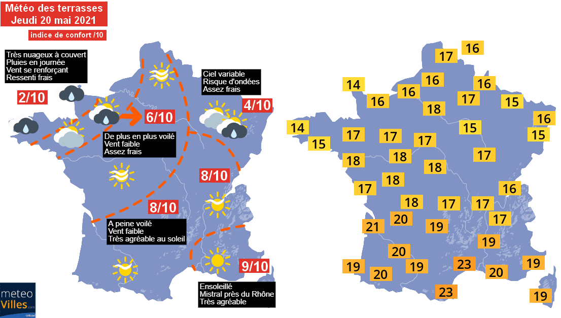 Temps sensible et températures prévues pour le jeudi 20 mai 2021 + indice de confort associé – Météo-Villes