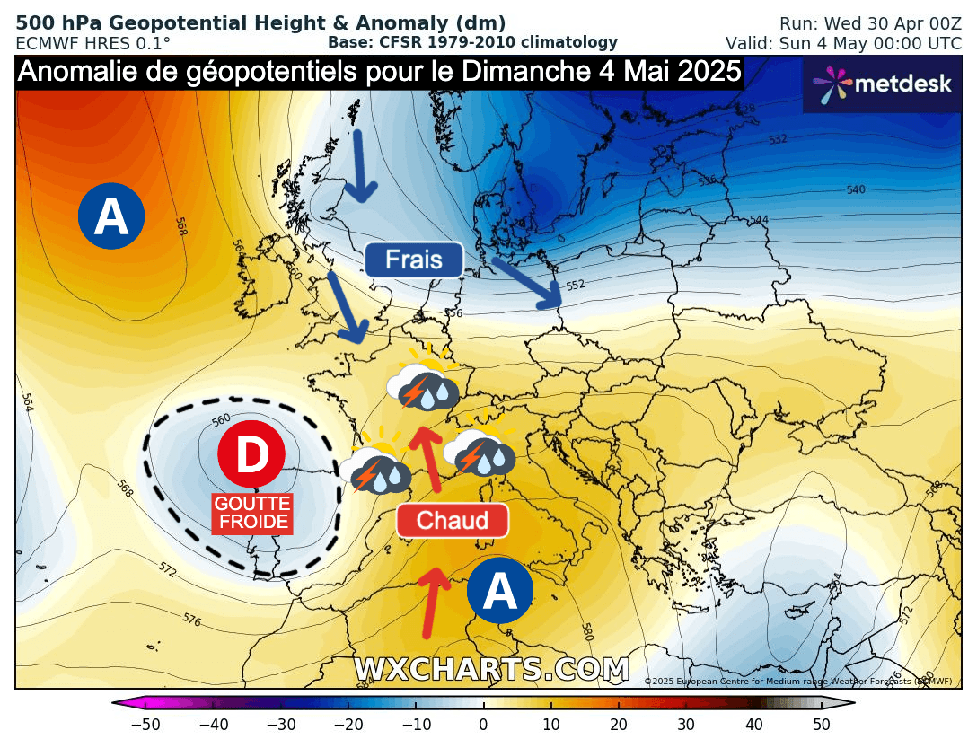 Il faut dire que tous les ingrédients d'une dégradation orageuse importante seront réunis, pour la première fois en cette année 2025. La France va vivre un changement de masses d'air spectaculaire. Samedi 3 mai 2025, les températures en altitude (vers 1500m) seront situées 8 à 12°C au dessus des moyennes de saison. Deux jours plus tard, le lundi 5 mai, elles plongeront 4 à 8°C en dessous des moyennes sur une large moitié nord ! Dans le nord de l'hexagone, la masse d'air perdra 15°C en moins de deux jours !