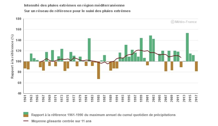 Si les épisodes méditerranéens ne semblent pas devenir plus fréquents, on observe en revanche une tendance nette vers une augmentation de leur virulence. La courbe ci-dessus montre le rapport à la normale 1961-1990 de l'intensité des pluies extrêmes sur les régions méditerranéennes. On observe une tendance à la hausse assez nette depuis les années 1990, décennie durant laquelle le réchauffement climatique s'est accéléré.
