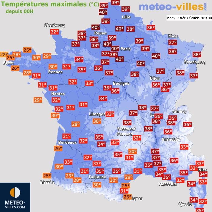 Températures maximales en France le mardi 19 juillet 2022 - Météo Villes