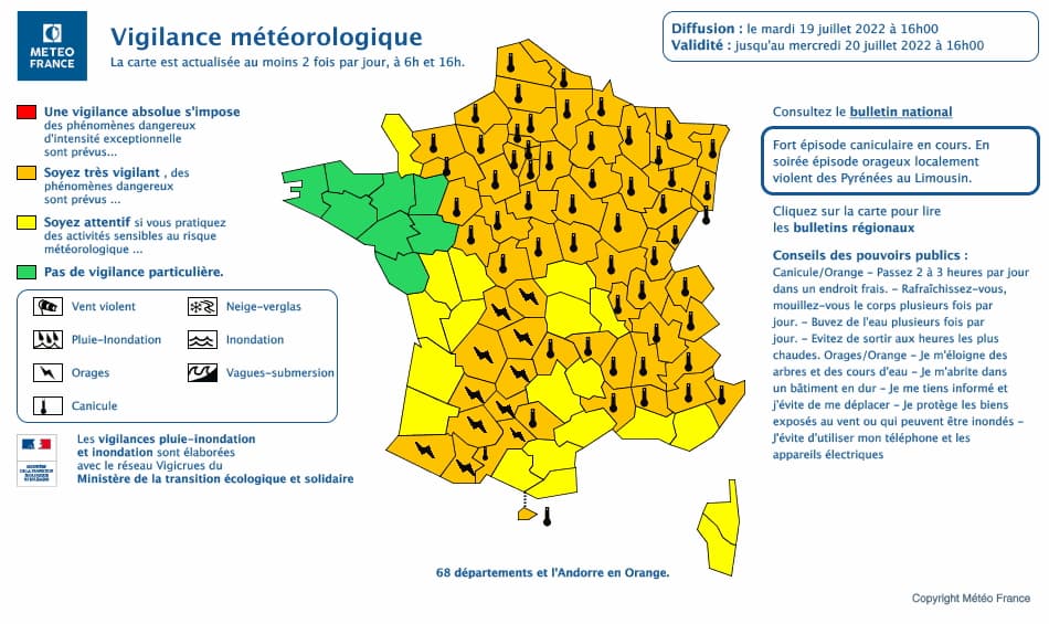 Carte de vigilance en vigueur le mardi 19 juillet 2022 à 16h - Météo France