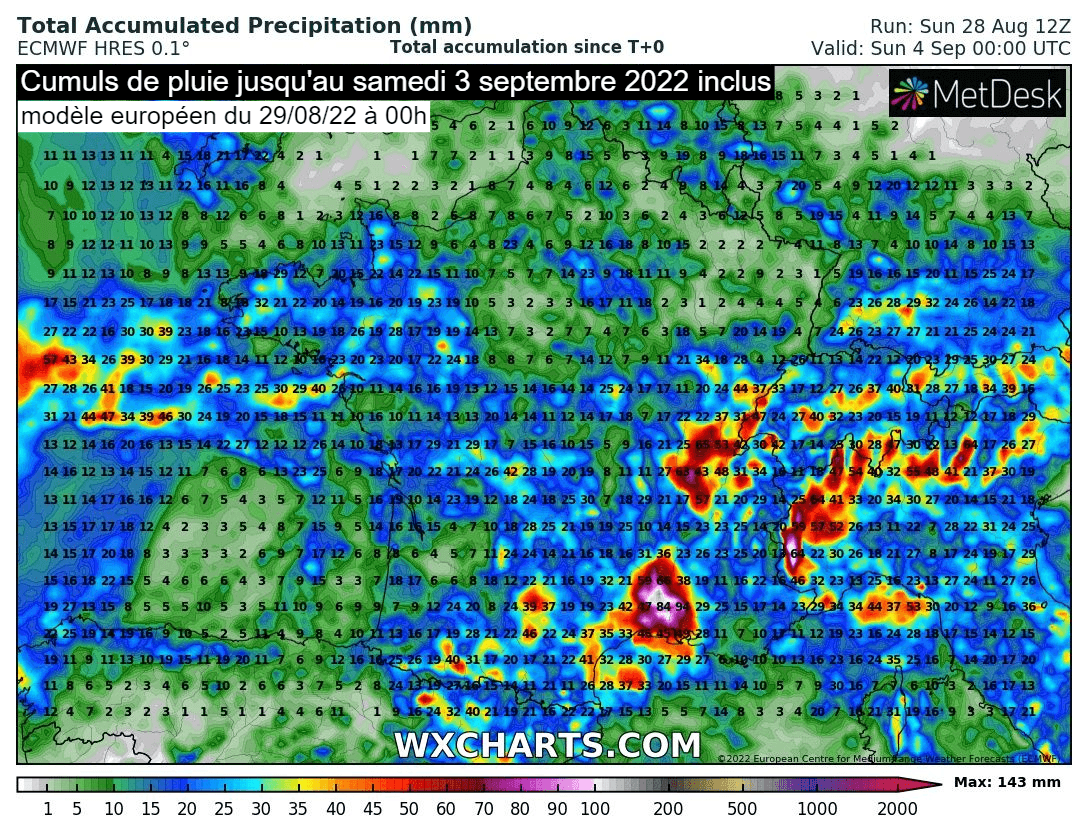 Cumuls de pluie jusqu'au samedi 3 septembre 2022 inclus - modèle européen via wxcharts.com