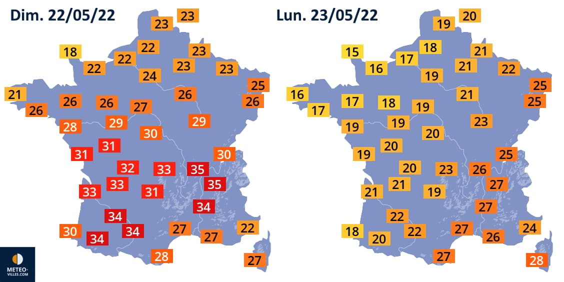Températures maximales prévues les dimanche 22 et lundi 23 mai 2022 - Météo Villes