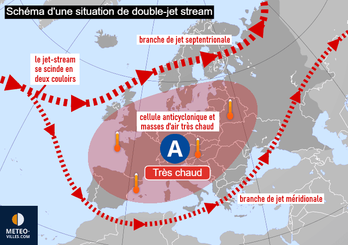 Cette configuration de double jet-stream est néfaste pour la France car les deux branches de jet ont tendance à piéger entre-elles une masse d'air chaud, formant une cellule anticyclonique peu mobile au sein de laquelle l'air peut devenir de plus en plus chaud. Si nous sommes en été, cette configuration peut conduire à une canicule et à une sécheresse importante, d'autant qu'elle peut perdurer plusieurs semaines.