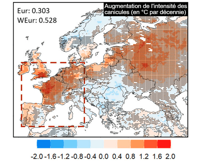 Si les vagues de chaleur européennes semblent s'accentuer plus vite que celles du nord de l'Amérique, il existe aussi des disparités sur le vieux continent. Comme nous l'avons développé plus haut, les effets du double jet-stream impactent notamment l'ouest de l'Europe. Ainsi, l'étude conclut que l'intensité des vagues de chaleur va augmenter d'environ 0,3°C par décennie sur l'ensemble de l'Europe mais de plus de 0,5°C par décennie sur sa partie ouest. D'ailleurs, une large partie nord-ouest de la France et le sud de l'Angleterre sont les zones les plus rouges, susceptibles de voir l'intensité des canicules s'intensifier de plus d'un degré par décennie !