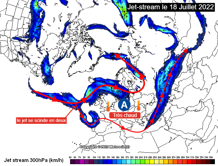Jet stream observé le 18 juillet 2022, jour le plus chaud de l'année en France - via meteociel.fr