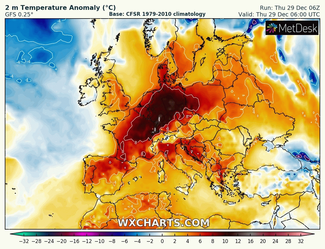 La journée de samedi 31 décembre devrait être la plus douce de ce nouvel épisode et même la plus douce jamais enregistrée sur la France. L’excédent thermique pourrait flirter avec les 8°C sur cette journée, parmi les plus importantes anomalies jamais enregistrées, tous mois confondus (record de +8,8 °C le 16 décembre 1989, suivi de +8,5 °C le 3 février 2020 et enfin +8,2 °C le 18 juin 2022).