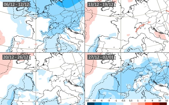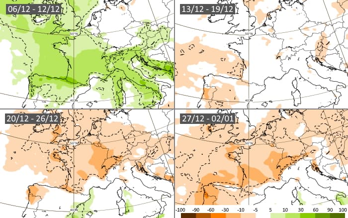 Projections des anomalies pluviométriques du 6 décembre au 2 janvier 2021 - modèle européen via ECMWF