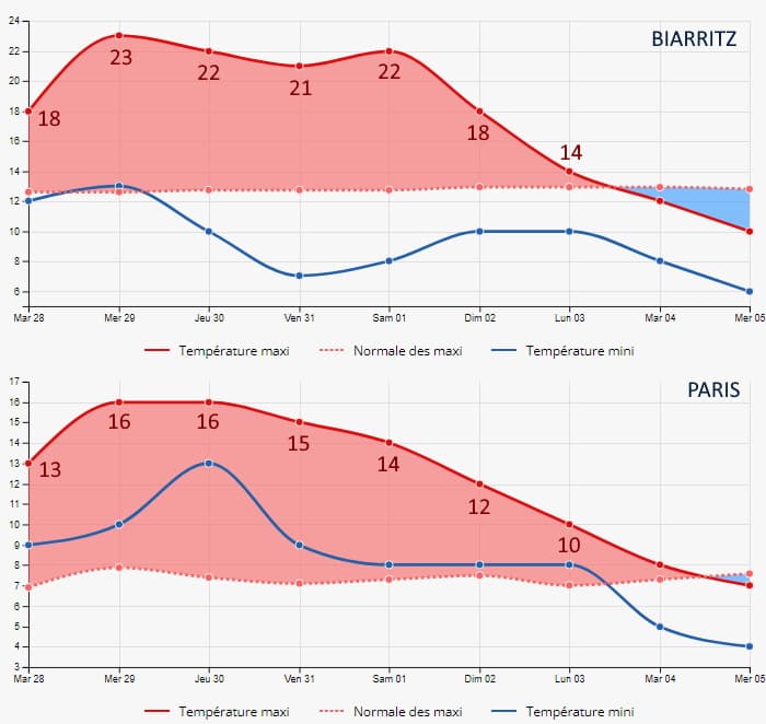 Températures de la semaine à venir à Biarritz (en haut) et à Paris (en bas) - Météo Villes