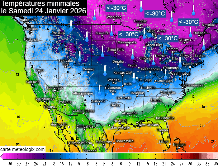 Le froid polaire s'installe pour ce week-end des 24 et 25 janvier 2026 dans tous le nord, le centre et l'est des USA. Dans les États du nord - frontaliers du Canada - les températures passent sous la barre des -30°C sous abri et le ressenti au vent peut atteindre localement -40 à -50 ! Ce froid glacial concerne aussi le centre et l'est du Canada où le thermomètre plonge entre -30 et -35°C avec des pointes de -40°C dans le Saskatchewan ! Les -15°C seront atteints jusque dans le centre des USA et dans l'État de New York.
