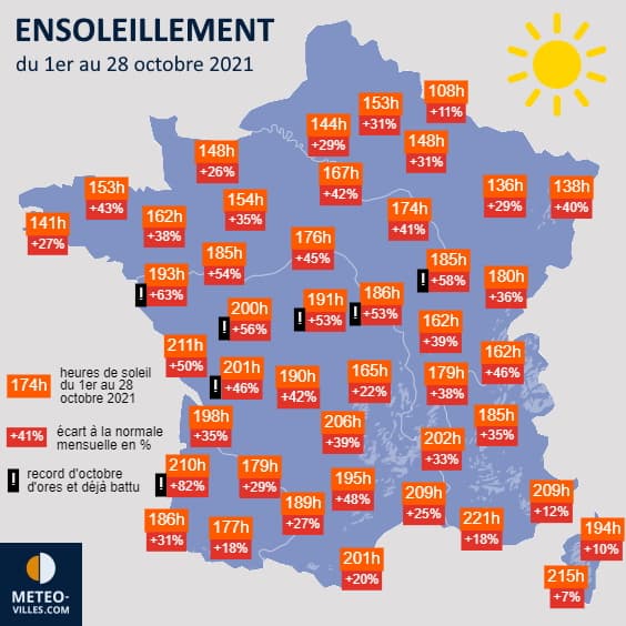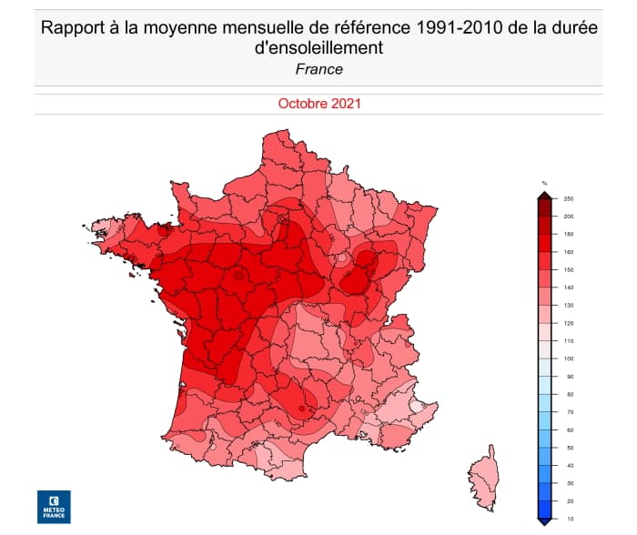 Sans surprise, l'ensoleillement de ce mois d'octobre 2021 est excédentaire à la normale sur la totalité du territoire français. Les écarts les moins prononcés sont rencontrés au sud-est, entre la Provence et la Corse ainsi que vers le Roussillon. À l'inverse, les régions du centre et de l'ouest enregistrent des taux d'ensoleillement particulièrement impressionnants, souvent 50 à 80% de plus que la normale d'un mois d'octobre classique entre la Bourgogne et l'océan où les niveaux records sont atteints !