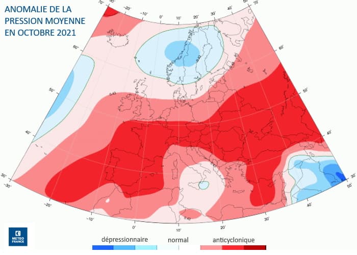 Anomalies de la pression moyenne en Europe au mois d'octobre 2021 - via Météo France