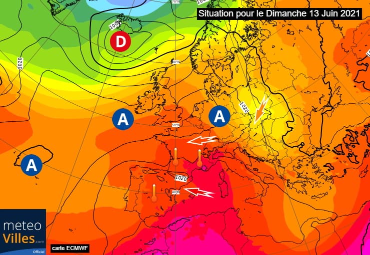 Notons que les journées du mardi 15 et du mercredi 16 juin 2021 seront probablement tout aussi chaudes avec un seuil des 30°C sans doute atteint jusqu'au nord-est de la France. L'atmosphère pourrait toutefois devenir lourde avec l'éclosion des premiers orages, susceptibles de se multiplier en milieu de semaine (mais les scénarios divergent encore).