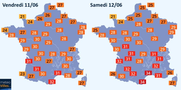Températures maximales prévues les vendredi 11 et samedi 12 juin 2021 - Météo Villes