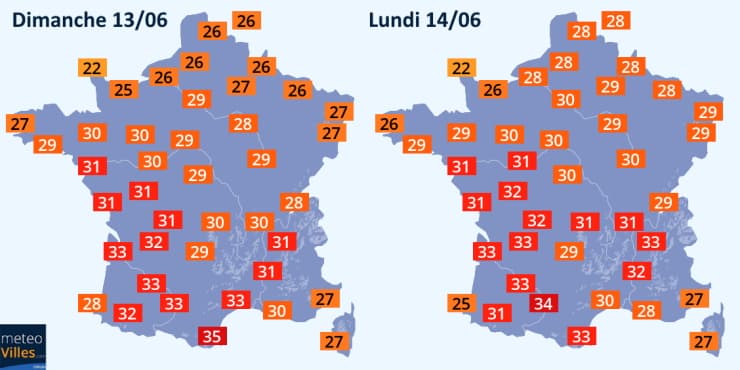 Températures maximales prévues les dimanche 13 et lundi 14 juin 2021 - Météo Villes