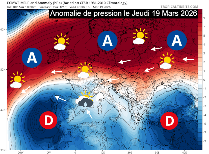 Selon les tendances, ce retour du rail océanique dépressionnaire ne s'annonce pas durable. Au contraire, les projections pour la semaine prochaine (du 16 au 22 mars 2026) envisagent un inversement de situation avec des hautes pressions qui s'installeraient des Îles Britanniques à la Russie et des dépressions sur le bassin méditerranéen et la péninsule ibérique. C'est donc un flux continental qui dominerait sur l'Europe, tout le contraire de la situation des prochains jours.