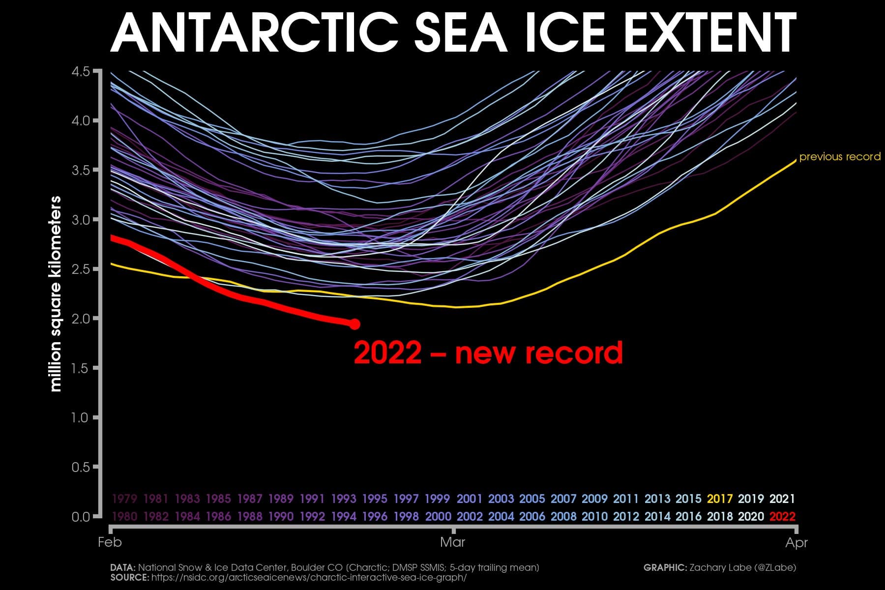 Note : les statistiques graphiques de Zachary Labe ci-dessus se basent sur des données issues de l'Agence d'exploration aérospatiale japonaise (JAXA) dont les valeurs de superficie des glaces diffèrent d'environ 0.5 millions de km2 par rapport aux données américaines du NSIDC.