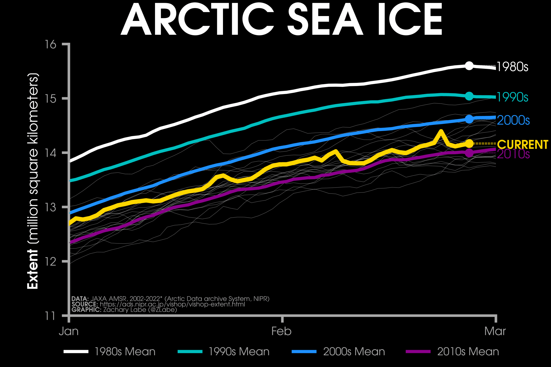 Étendue de la banquise Arctique en millions de km2 - période 1er janvier - 1er mars depuis 1979 - Zachary Labe – JAXA