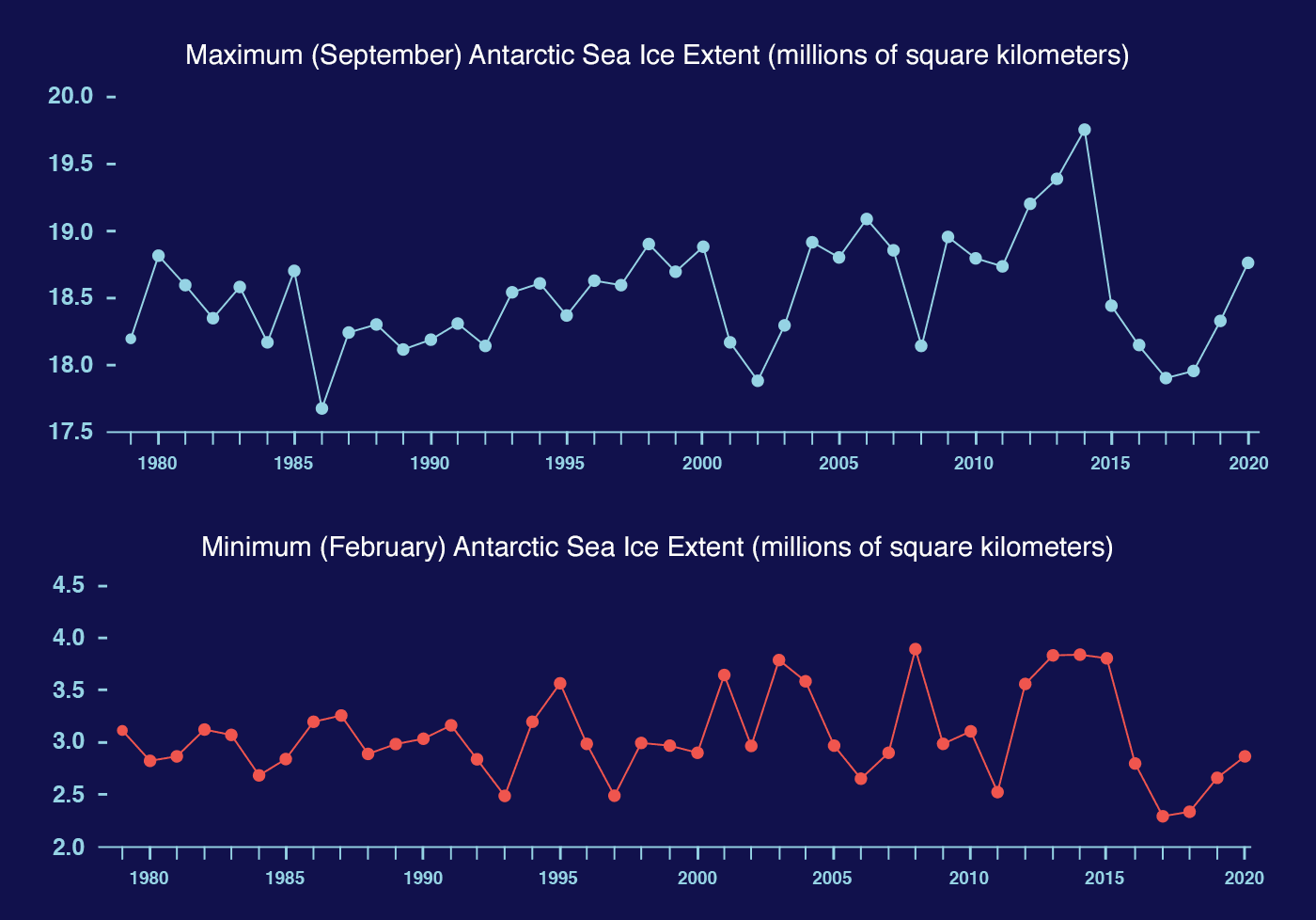 Extension de banquise australe lors du maximum (haut) et du minimum (bas) annuel entre 1979 et 2020 – NASA