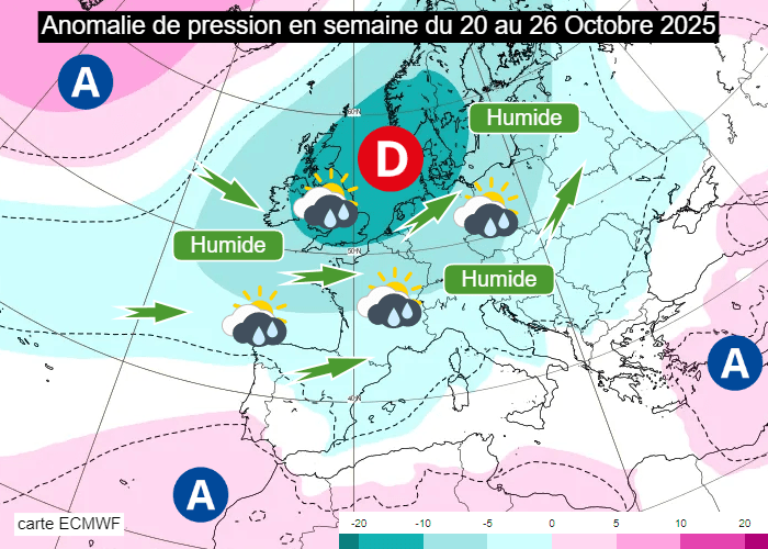 Anomalie de pression en semaine du lundi 20 au dimanche 26 octobre 2025 - ECMWF