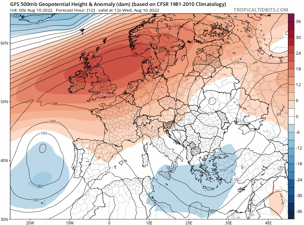 Anomalie de géopotentiel du mercredi 10 au jeudi 18 août 2022 - via tropicaltidbits.com