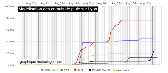 Projection multi-modèles des précipitations à Lyon jusqu'au vendredi 19 août 2022 - via meteologix.com