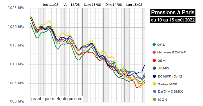 Une chose est certaine : les baromètres ont commencé à baisser et vont chuter d'ici à la mi-août 2022. En cause, un affaissement de la barrière anticyclonique actuellement présente entre les Açores et la Mer Baltique, permettant aux anomalies dépressionnaires nord-atlantiques de s'étendre vers les Îles Britanniques et la France. À Paris, la pression devrait s'établir entre 1005 et 1010 hPa selon les modèles d'ici le lundi 15 août 2022.