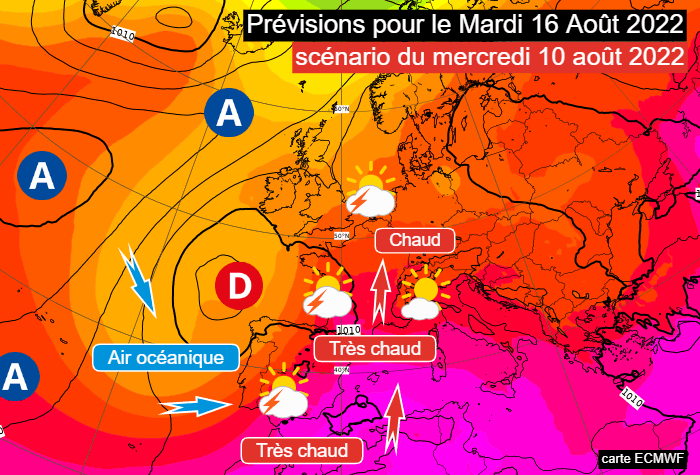 Projection pour le mardi 16 août 2022 par le modèle européen du 10 août - via ECMWF