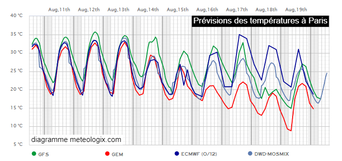 Projection multi-modèles des températures à Paris jusqu'au vendredi 19 août 2022 - via meteologix.com