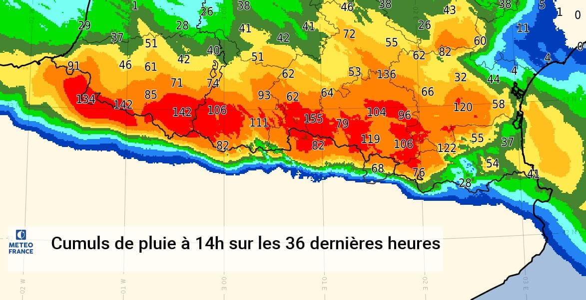 Durant ces 48 heures, les cumuls de précipitations s'annoncent particulièrement importants, atteignant 150-200mm en montagne, voire localement jusqu'à 250mm. Sur les contreforts et le piémont, les cumuls seront compris entre 100 et 130mm. Les quantités seront graduellement plus modérées en se dirigeant vers les plaines (30-50mm sur le Midi-Toulousain).
