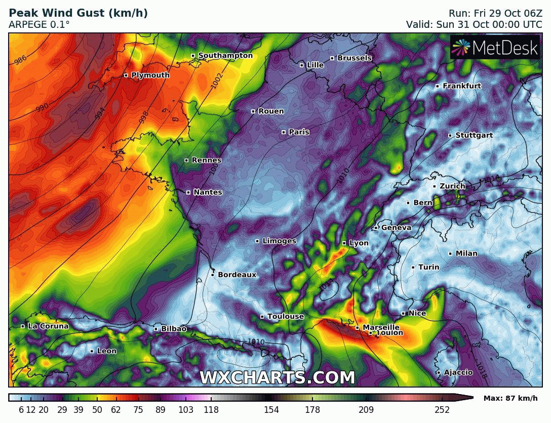 Rafales de vent maximales attendues entre samedi 30 et dimanche 31 octobre 2021 – Modèle Arpège via WX CHARTS