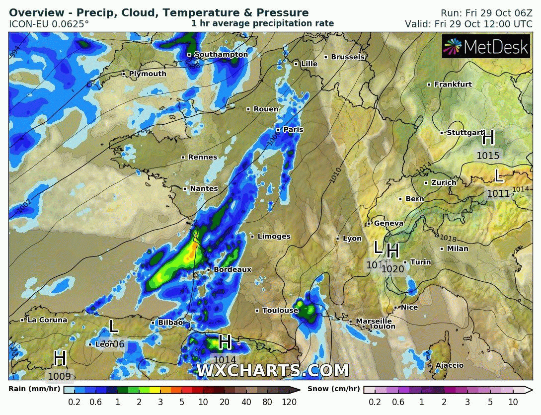 Animation des précipitations sur la France entre le vendredi 29 octobre et le lundi 1er novembre 2021 - Modèle ICON via WX CHARTS