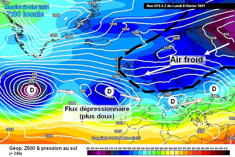 A l’arrière du front neigeux de mardi/mercredi l’air sec et froid devrait s’imposer plus au nord, un puissant anticyclone s’ancrant sur la Scandinavie. La suite reste encore indécise, les scénarios diffèrent en effet grandement quant à la persistance du froid ou la reprise d’un flux océanique un peu plus doux. La France se situerait à nouveau en zone de conflit, à la limite entre air glacial circulant sur l’Europe et air plus doux et perturbé sur l’Atlantique.