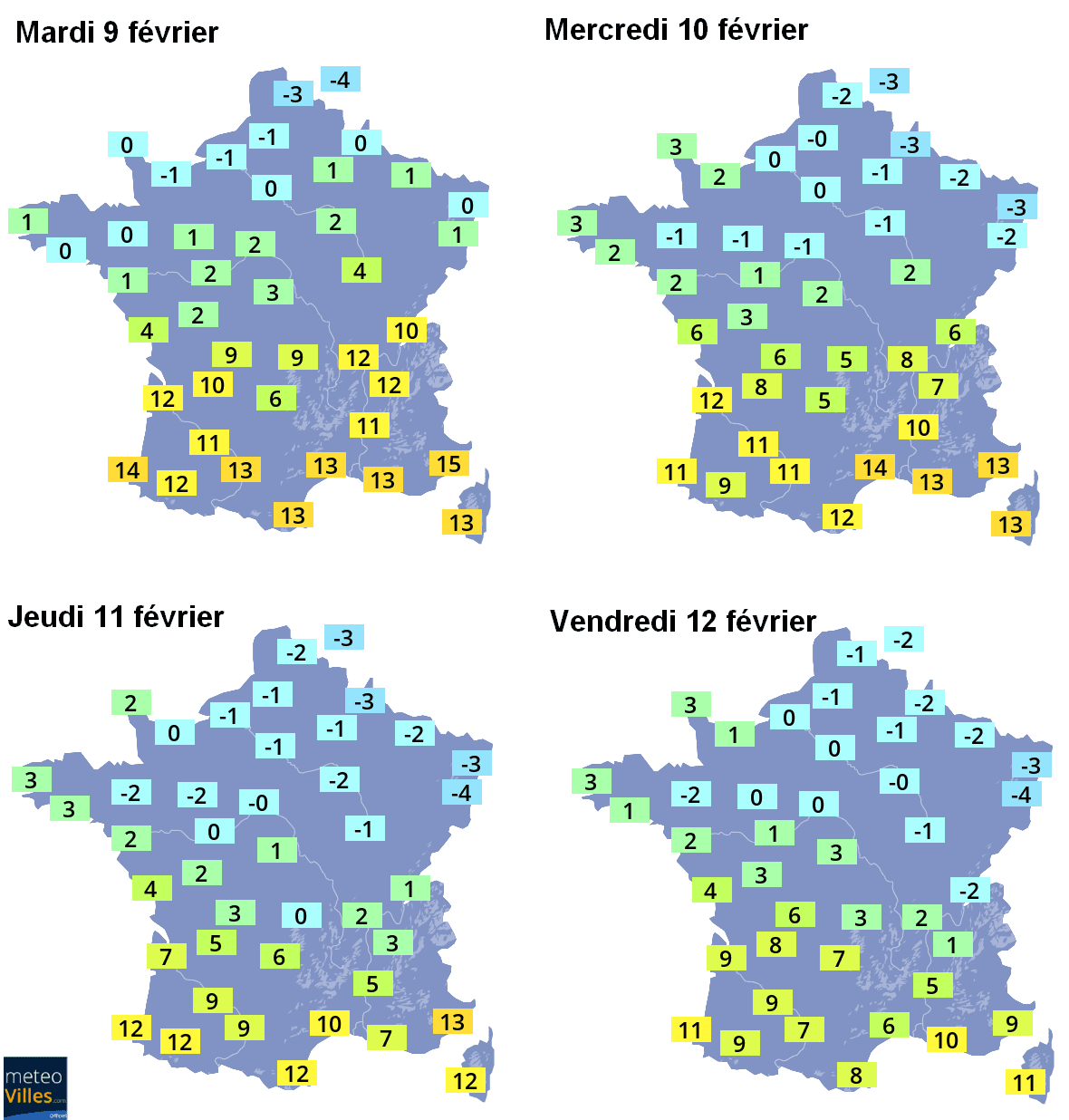Températures maximales prévues du mardi 9 au vendredi 12 février 2021 – Météo-Villes