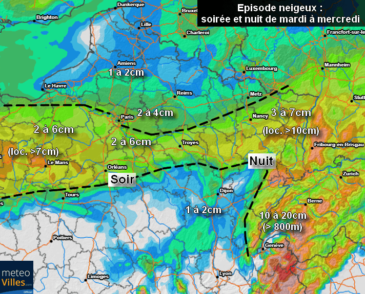 >> Ce front se décalera en cours de journée vers l’Est, atteignant le Centre et la région parisienne en soirée et enfin l’Alsace durant la nuit suivante en déposant généralement entre 2 et 6cm sur ces régions, plutôt 3 à 7cm sur le Nord-Est du pays, localement plus de 10cm près des Vosges.